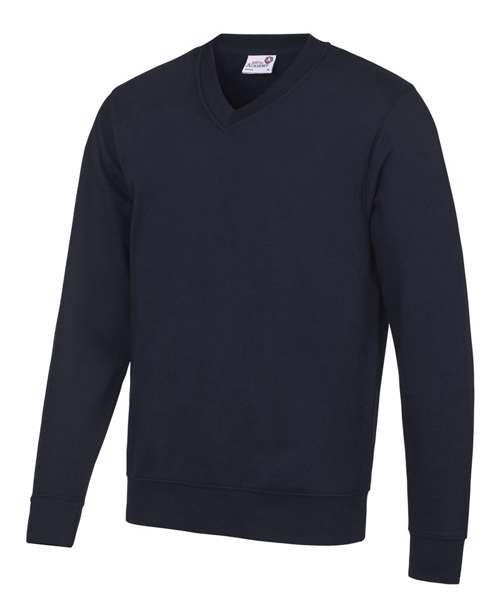 V-neckline sweatshirt. Ribbed neckline, cuffs and hemline. Soft cotton faced fabric creates ideal printing surface. Name label at back neck. Taped neck. Twin needle stitching for durability.