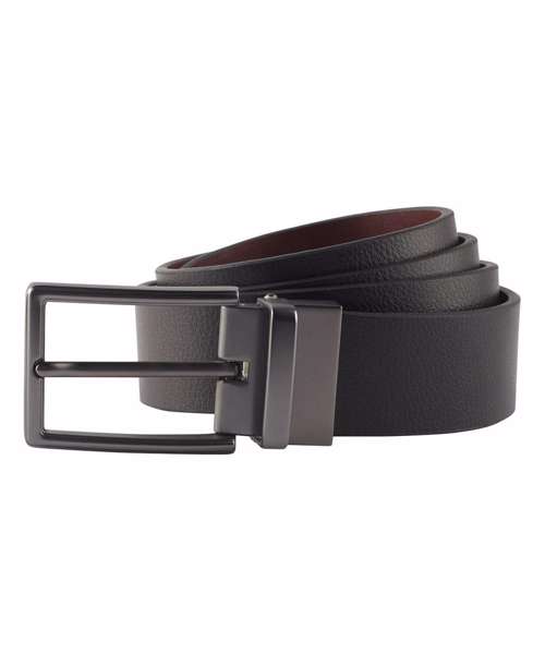 Leather two-way belt. Buckle and belt loop. Belt can be twisted to alternate between brown and black leather. Product contains no branded neck label. Removable Kimble or looped garment tags. Inner seam label holds important product information on one label with a second label containing brand information which can be cut-away.*Please note old stock may contain a fixed branded label.