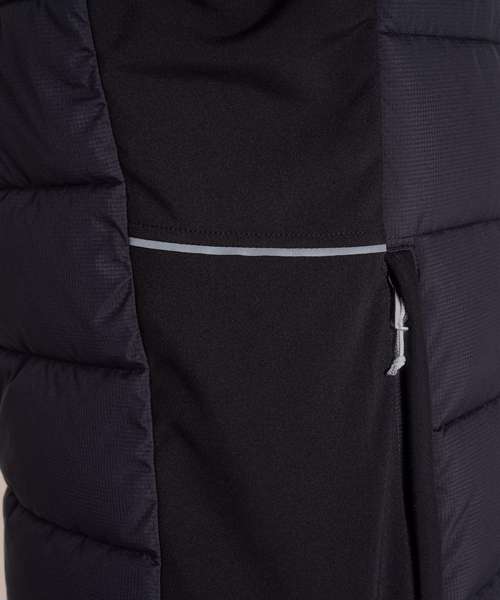 Part-recycled polyester elastane softshell with microfleece back and H2OShield DWR finish to upper body and hood. Part-recycled polyester ripstop to front and back body with H2OShield DWR finish, recycled polyester hollowfibre fill and recycled zip tapes.