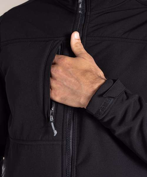 Part recycled polyester elastane softshell with borg back, AquaDry Membrane, H2OShield DWR finish and part recycled zip tapes. GRS Certified fabrics, ETI factories, REACH compliant.