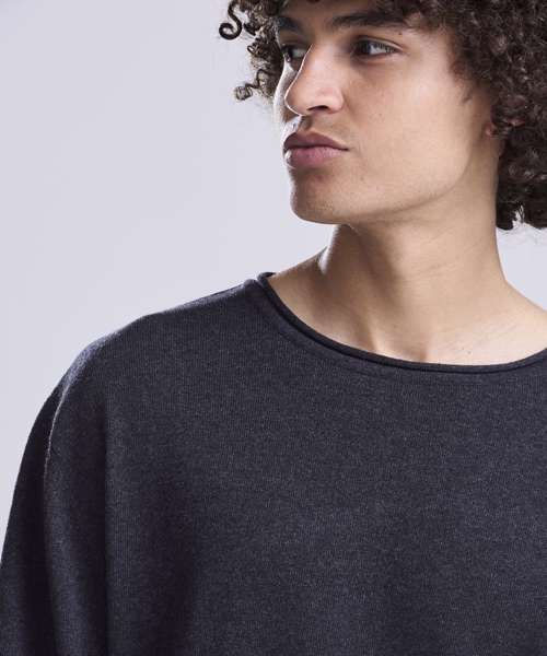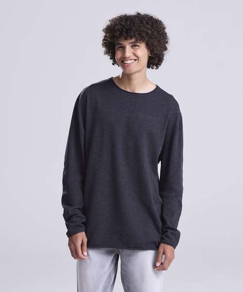 Lightweight sweater made from regenerated cotton. Set-in sleeves with rolled cuffs , hem and collar.