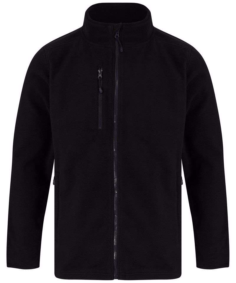 Fabric using recycled materials. Made from recycled polyester. Anti-pill microfleece. Recycled zips. Set-in sleeves. Shoulder panel. 2 single welt zipped pockets. Zipped chest pocket. Back neck tape. Back neck outer hanging loop. Full-length front zip with zip guard and facing. Non-slip zip pulls. Stretch binding on collar and cuffs. Henbury cut-out label for easy rebranding.