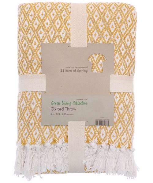 Oxford design throw made from recycled fabrics, 170 x 200cm. Beautifully soft, made from reclaimed clothing mixed fibres. Modern geometric pattern with plain ivory fringing to edges. Help the environment with an eco-friendly throw – ideal for a bed or sofa, or as a picnic blanket.
