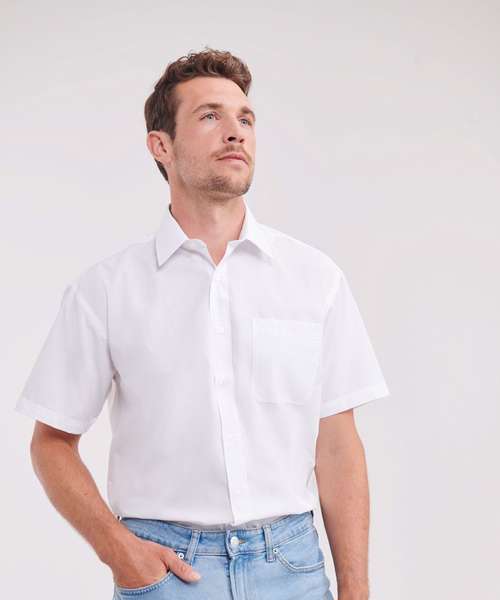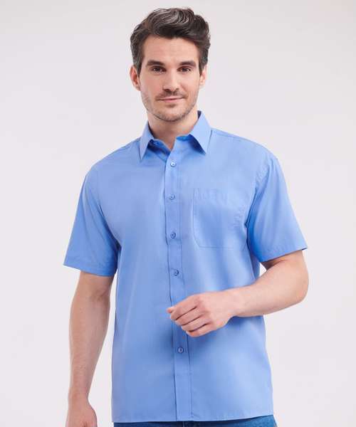 Smart and stylish shirt design in a fine poplin fabric. Classic style boned collar. Back yoke with 2 side pleats. Pocket over left chest mitred edge. Straight bottom hem. The elegant lightweight fabric is especially suited to finer embroideries.