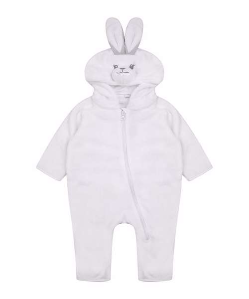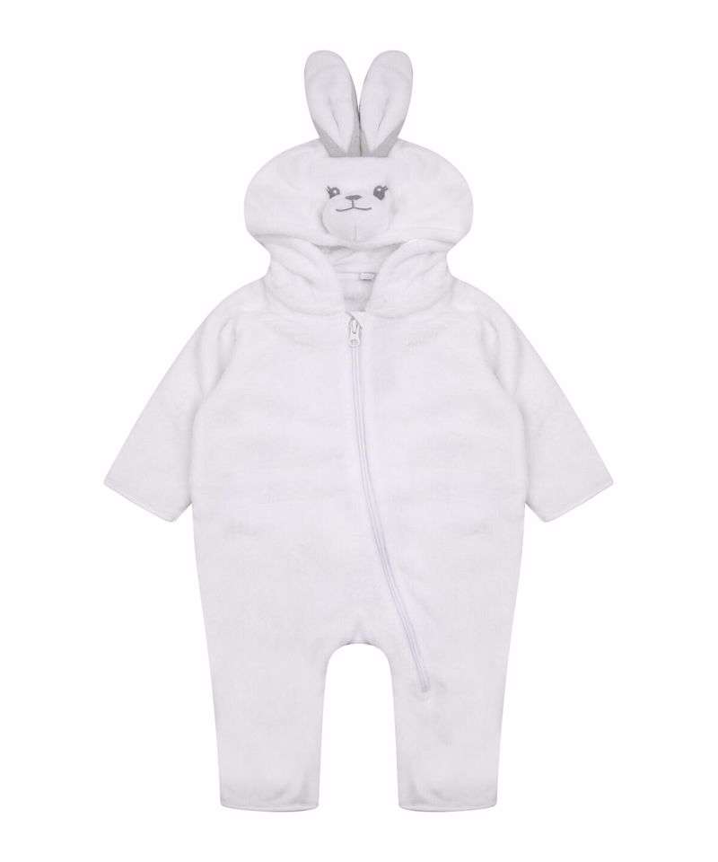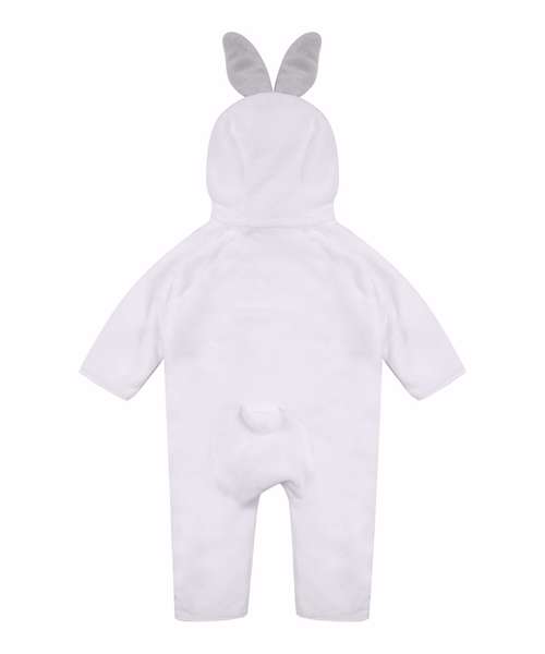 Hooded all-in-one in super-soft plush fabric with rabbit ears, eyes, and nose detailed on the hood. YKK zip down the centre front and down the leg. Tail detail on the back. Binding on sleeve and leg hems.