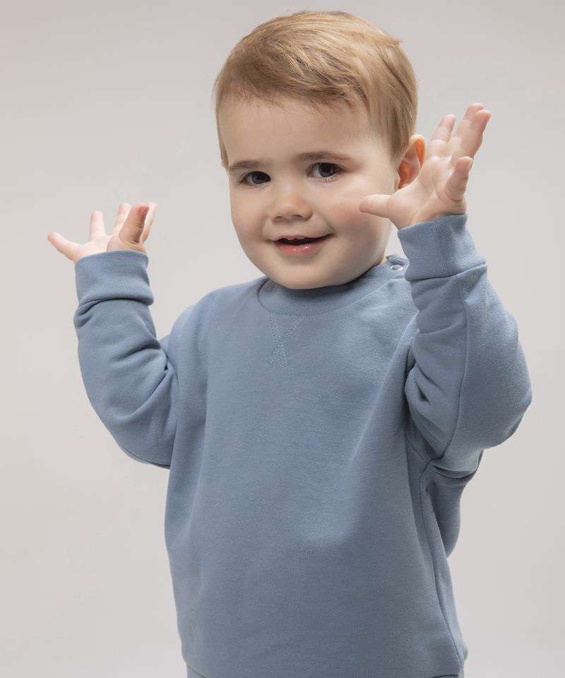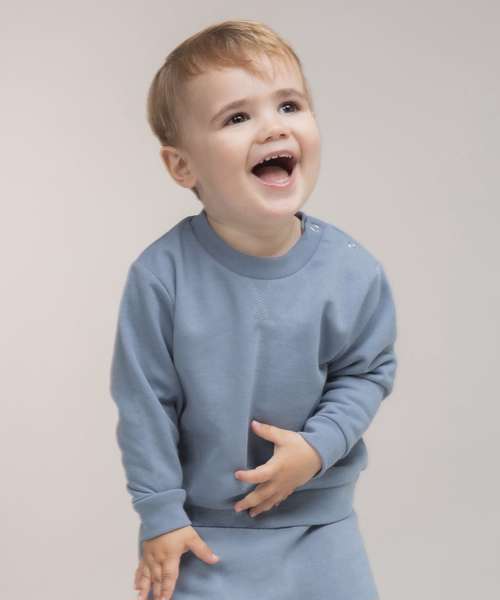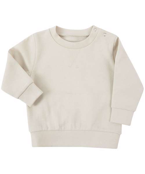 Kids' sweatshirt made in recycled fabric with self-fabric knitted rib at neck and cuffs. Flatlock V stitching detail at the CF neck. YKK popper fastening on the shoulder on sizes 0/6 – 24/36 only. Tag-free.