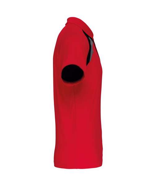 100% polyester. Quick drying fabric. Contrast panels. Flat knit collar. 2 button placket. matching cover stitch. Twin needle finishing.