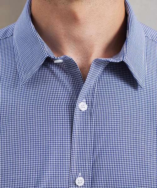 A short sleeve shirt with soft collar styling. Two colour Microcheck gingham style pattern. Semi-fitted styling.