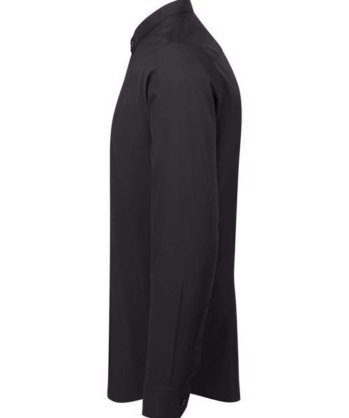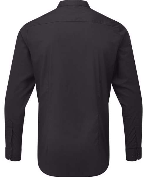 Long sleeve unisex shirt. Double button cuff and sleeve guard. Typical banded grandad collar with top button fastening. Easycare fabric.