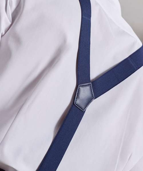 Y back trouser braces with stretchy elastic fabric for comfort and style. 3cm strap width. Two metal non slip clips to the front for attachment to trousers. One clip to the back. Metal lock buckles for adjustment making a one-size-fits-all piece.