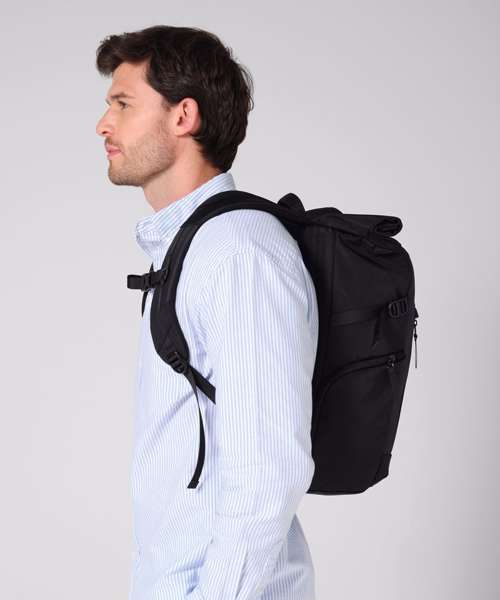 The Zürich roll-top backpack brings flexibility and function to everyday travel. Constructed from recycled materials, it includes a padded laptop sleeve, multiple zipped pockets and a spacious roll-top closure for adaptable storage. Ergonomic straps, a padded back panel and compression straps provide comfort and support, making it ideal for commuters and outdoor explorers alike.