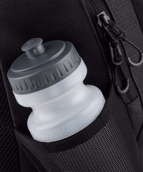 TearAway label for ease of rebranding. Laptop compatible up to 15.6". Dual compartment design. Padded laptop compartment. Reflective accents. Two mesh pockets/ water bottle holders. Zippered front pocket. Internal mesh pocket. Ergonomic padded back panel. Padded adjustable mesh shoulder straps. Adjustable chest straps. Grab handle. Reach certified.