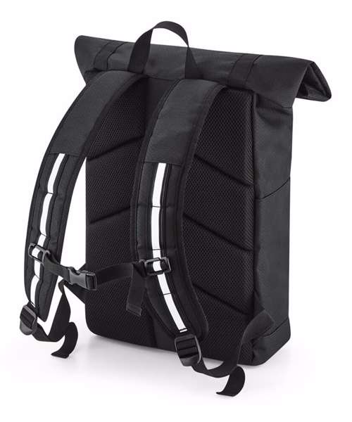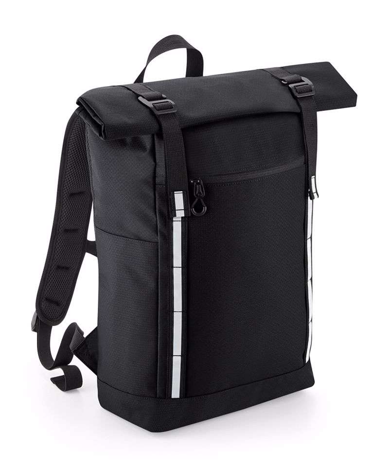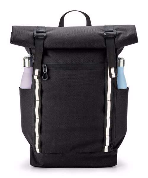 Low-profile streamlined design. Weather-resistant roll-top closure. Glove-friendly metal buckles. Quick-access zipped front pocket. Two external bottle pockets. Padded internal laptop sleeve, compatible up to 15.6". Enhanced-visibility reflective stripes. Ergonomic, breathable padded mesh back panel. Ergonomically designed straps for everyday comfort. Fully adjustable chest strap. Durable, water-repellent treatment for increased weather protection. PVC-Free. TearAway label for ease of rebranding. Reach certified.