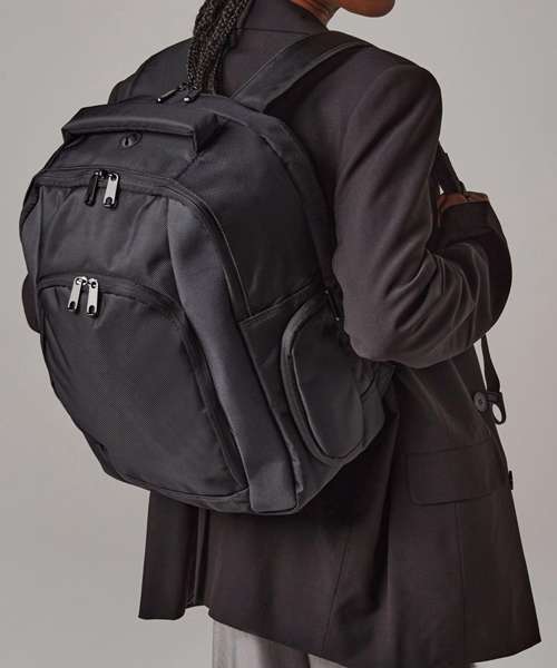Media pocket and headphone port. Padded laptop compartment. Laptop compatible up to 15.6". Padded adjustable shoulder straps. Front pocket organiser section, side zippered pockets, and water bottle holder. Grab handle.