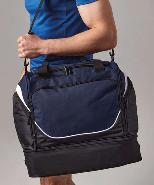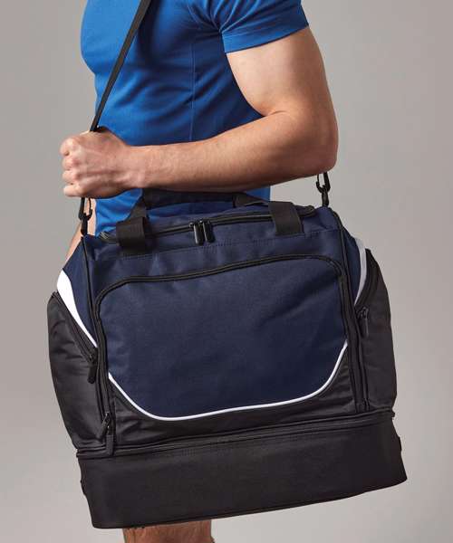 Designed to fit most lockers. Dual compartment design. Structured, ventilated base compartment. Front pocket designed for easy decoration. Zippered end pockets. Internal valuables pocket. Internal mesh pockets. Detachable adjustable shoulder strap with pad. Padded hand grip. Protective base feet.