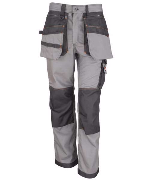 Removable multi-use front pocket system including. ID pass pocket. Contrast stitch bar tack stress points. Bellowed cargo and rear pockets. Front zip with rivet fastening. Reflective back leg strip. Belt and hammer loops. Cordura® ankle hem. Knee pad pockets. Belt loops. D-rings. Co-ordinated X-OVER range. Generous fit. Tough and hardwearing look for on- and off-site wear. Reinforced ankle hem for scuff resist.