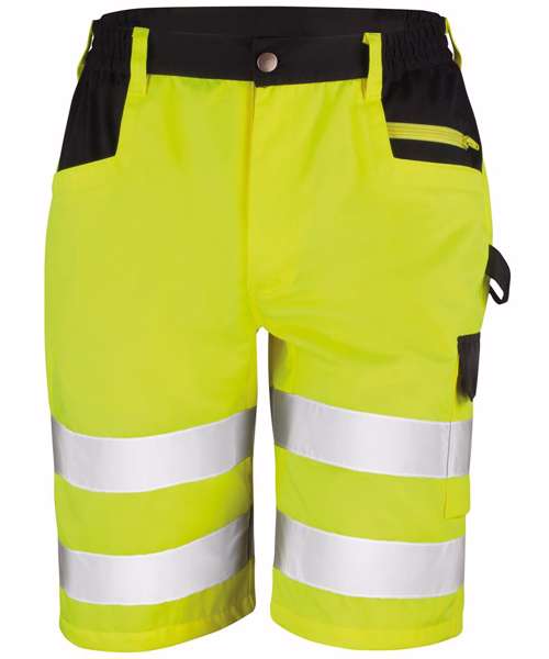 Functionality and high visibility performance are delivered without compromise in these tough and rugged safety cargo shorts. Multiple pockets, bar tacked stress points and hammer loop bring the performance whilst elasticated waistband, knee pad pockets and reflective leg bands bring the comfort and safety. Everything you expect and more from an EN20471 Class 2 safety short.