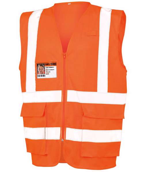 Lightweight mesh safety vest with 50mm sewn on reflective body bands. Self-coloured bound edges. Tear release patch pockets. ID pass pocket. Zipped closure. Radio loop. EN ISO 20471:2013 Class 2 .