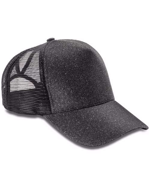 5-panel cap (4 mesh/1 fabric). Sparkle fabric stiffened front panel and peak. Mesh back with ponytail hole. Tear-release adjuster. Semi-curved fabric peak made from recycled plastic. Tear-away label.