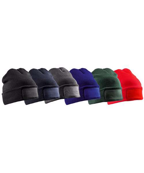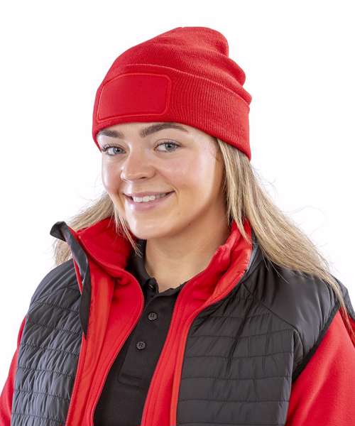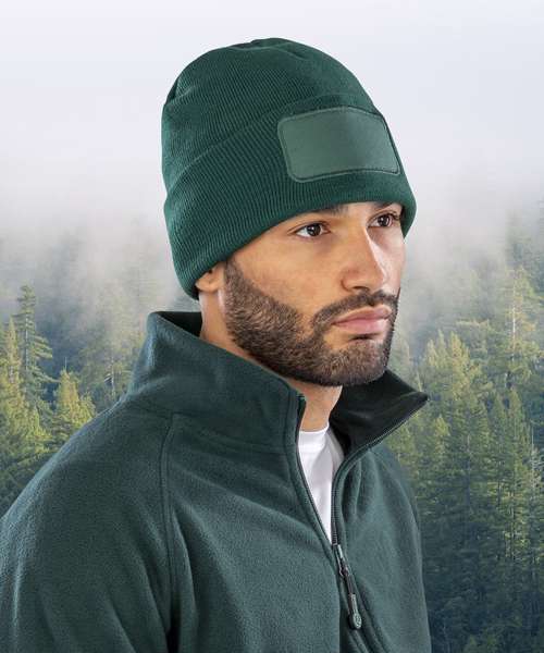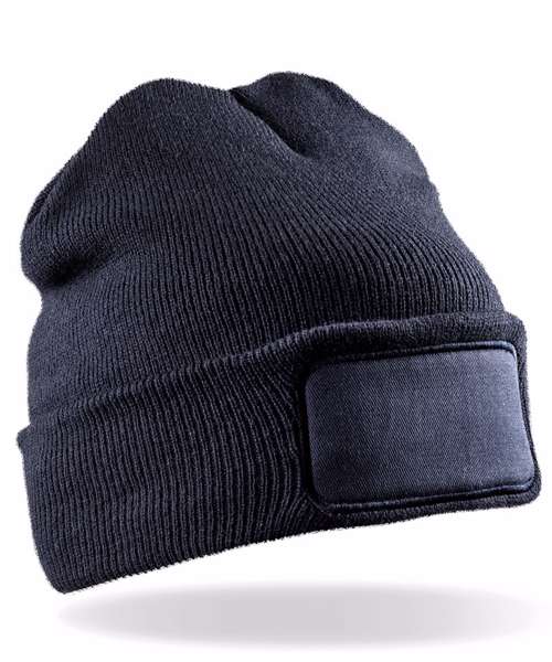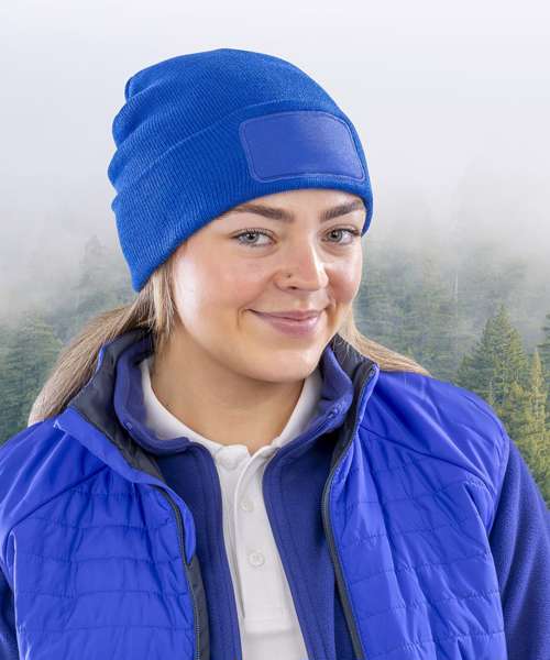 Double knit beanie made from 50% recycled materials. Cotton twill patch for printers. Double thickness. Full size style. Soft-feel knit. Deep cuff.