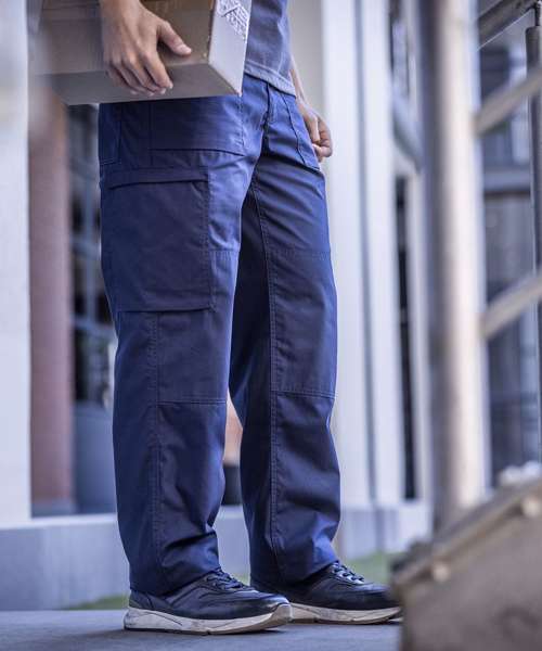 Part-elasticated waist. Knee patches. Belt loops. Multi-pocketed with concealed zips. 2 front large pockets with hem bellows. Right side zipped pocket with welt covering. 2 back pockets - one zipped pocket with welt covering.