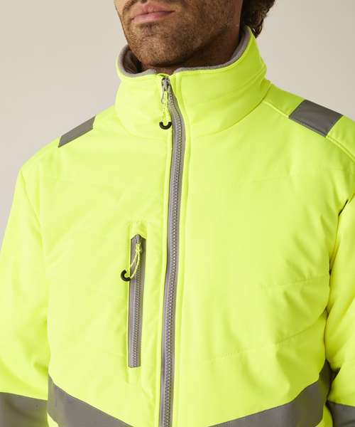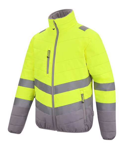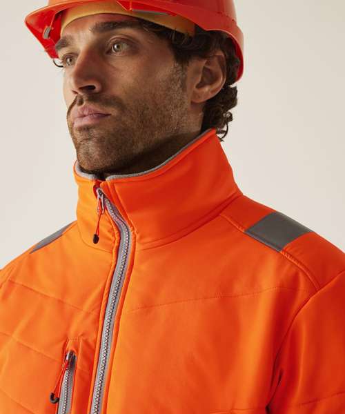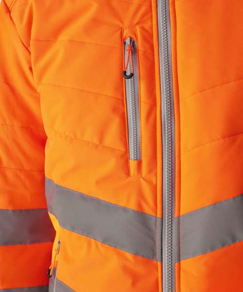 Lightweight four-way stretch fabric with a durable water-repellent finish. Warmloft insulation, 160gsm. Certified EN ISO 20471:2013 A1:2016 Class 2. Orange colourway is also certified to RIS-3279-TOM. One zipped chest pocket and two lower zipped pockets. Internal pocket. Fleece-lined collar. Stretch binding to armholes. Concealed inner zip for embroidery access. Darker contrast panels, ideal for dirty environments.