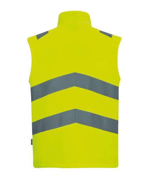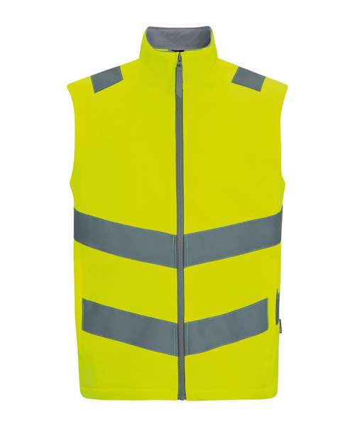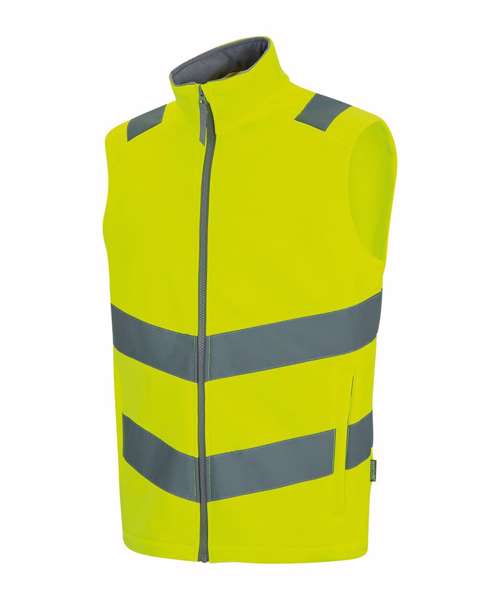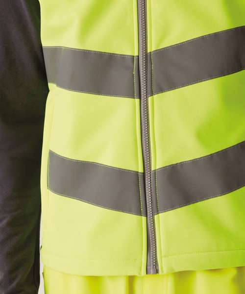 Warm-backed softshell fabric. Printable softshell fabric. Certified to EN ISO 20471:2013 A1:2016 Class 2. Orange colourway also certified to RIS-3279-TOM. Two lower zipped pockets. Fleece-lined collar. Zip guard for comfort when worn. Contains recycled polyester.