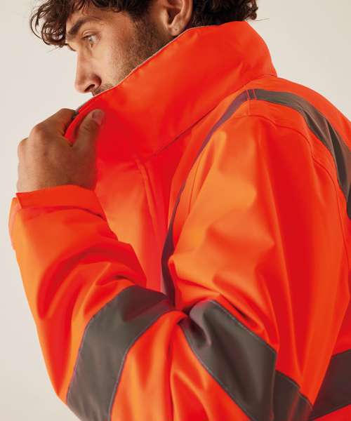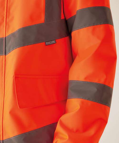 Waterproof Hydrafort 100% Polyester Oxford 300DD fabric. Medium-weight Thermoguard insulation, 100gsm. Certified to EN ISO 20471:2013 A1:2016 Class 3. Orange colourway is also certified to RIS-3279-TOM. Conforms to EN343:2019 Class 3:1. Two lower pockets. Internal pocket. Pack-away hood with adjusters. Adjustable cuffs with hook-and-loop fastening.