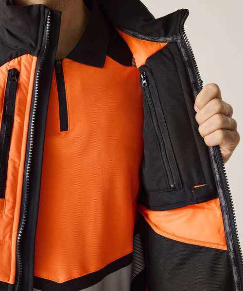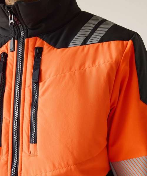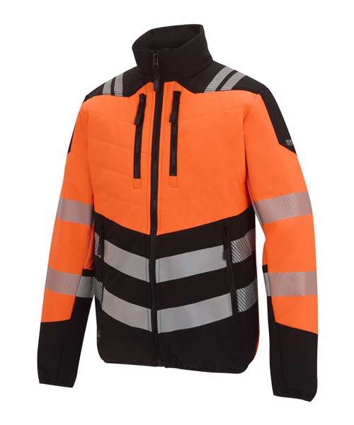 Lightweight four-way stretch fabric with durable water-repellent finish. Mechanical stretch softshell on sleeves and side panels for improved fit and freedom of movement. Warmloft Insulation on chest and back. Certified to EN ISO 20471:2013 A1:2016 Class 2. Orange colourway also certified to RIS-3279-TOM. Heat-applied reflective tape with segmented tape on strategic panels for additional comfort. Two zipped lower pockets and two zipped chest pockets. One internal zipped chest pocket and one lower mesh pocket. Centre front zip with inner chin guard. ID reflection – angled chevrons indicate which way the wearer is facing: towards or away.