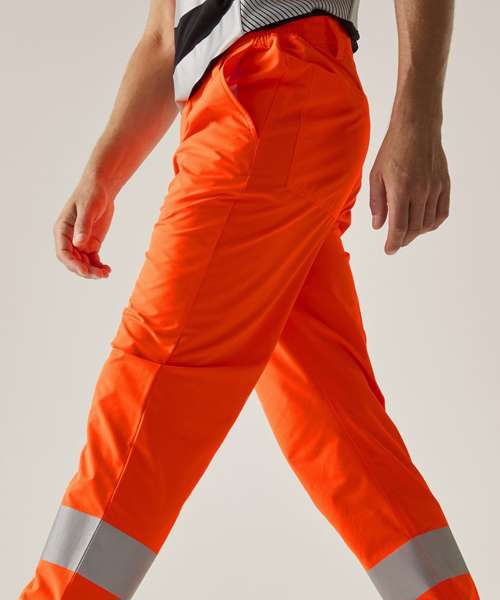EN ISO 20471:2013 + A1:2016 Class 1. Durable heat-applied reflective tape. Elasticated waistband. Strategic seams with triple stitching. Shank button at waist for extra strength. Lower leg cargo pocket. Two back pockets. Extendable hem offering a choice of leg lengths. Durable heat-applied reflective tape. Contains recycled polyester.