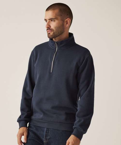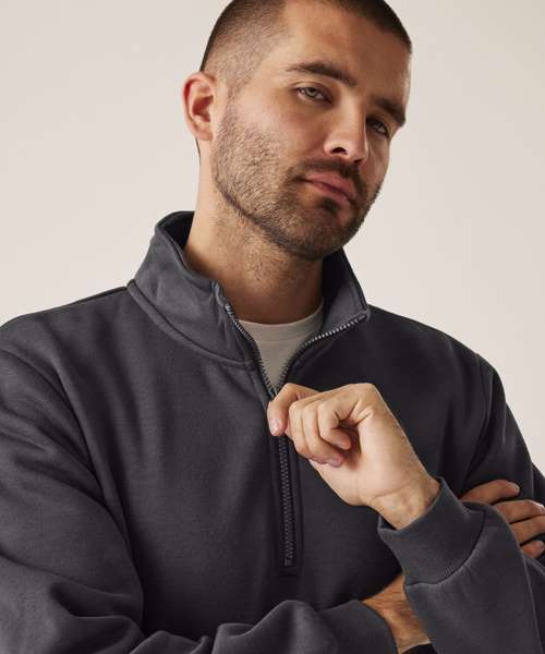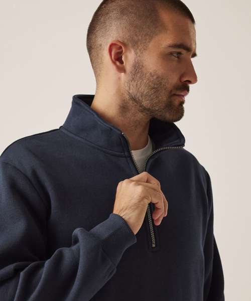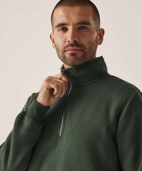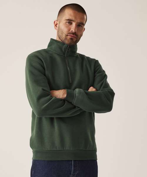 35% sustainable cotton and 65% polyester brushed back fabric. Ribbed cuffs and hem. Half-zip.