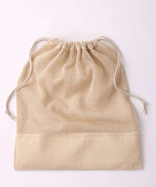 100% Recycled cotton. Rope drawcord closure. Mesh main body. Cotton panel for easy decoration. Multipurpose use. One size. Food safe.