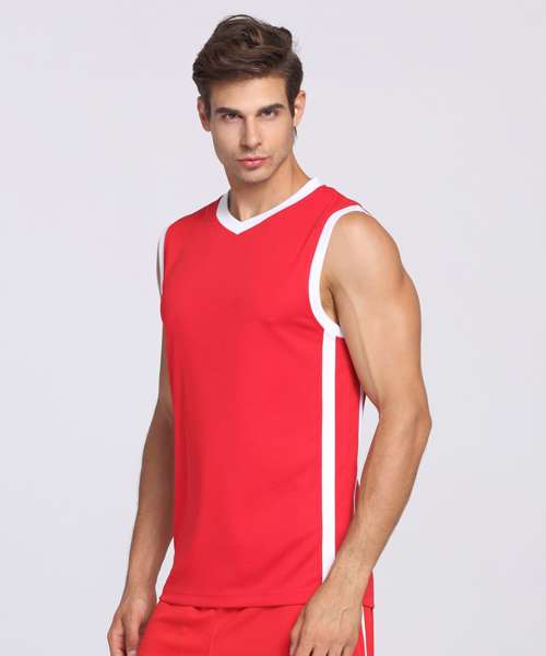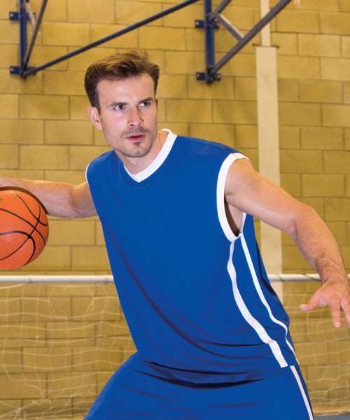 Contrast v-neck & armhole trim. Contrast side stripes. Extremely lightweight in soft athletic quick dry fabric. Comfort fit in traditional baggy style. Breathable. Co-ordinate with S279M Basket Ball shorts.