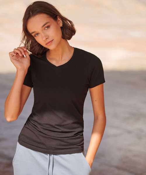 Feel good women's stretch t-shirt with enzyme wash for unique soft hand-feel. 96% cotton, 4% elastane for improved fit, comfort and shape retention. Modern long-line fit. V-neck with back neck binding and soft stretchy rib neckline. Features tear out label.