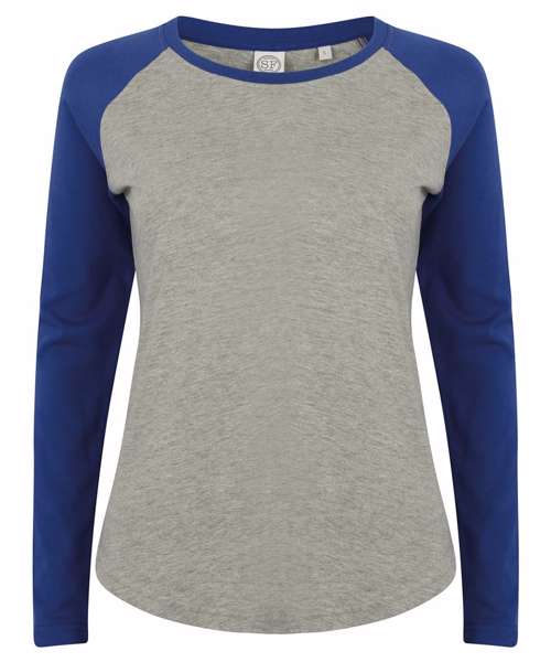 Tear-out SF (Skinnifit) label. Contrast raglan sleeve and ribbed neck with back-neck tape. Long-line fit and shaped side seams. Twin-needle curved hem. Unisex. Matches men's SK271 and women's SM271 Long sleeved baseball T's.