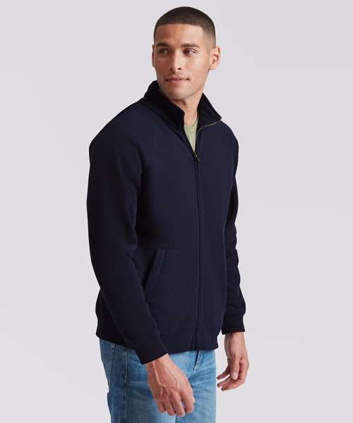 Featuring a 100% cotton face and covered metal zip for enhanced printability, the Premium sweat jacket is perfect for promotions, music merchandise, licensing, tourism and more. This garment has two front pockets for multi-purpose use and a single Jersey back neck tape for comfort, while the cadet collar and cotton/elastane waist and cuff ribs provide everyday comfort and added warmth.