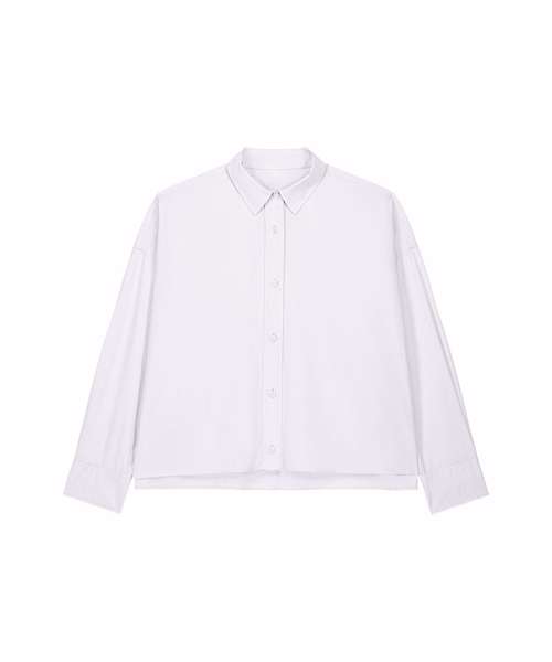 Women’s boxy shirt. Shirt collar with collar stand. Grown-on placket with single-needle topstitching on each side. Back yoke with twin-needle stitching. Forwarded shoulder seam with twin-needle stitching. Dropped shoulders. Square cuffs with single-button opening. Cuff placket with button opening. Shaped hem with side vents. Dipped back panel. Double pleats at cuff. Contains 100% certified organic cotton.