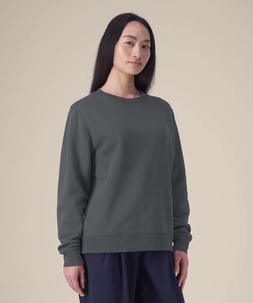 Women’s recycled cotton crew neck sweatshirt. Set-in sleeves. 1x1 rib at collar, sleeve cuffs and hem. Twin-needle topstitching on the seams at the shoulders, armholes, sleeve cuffs and hem. Inside herringbone back neck tape. Self-fabric half-moon at the back neck. Contains 50% GRS-certified recycled cotton and 50% OCS-certified organic cotton, certified by Control Union CB-CUC-1393082.