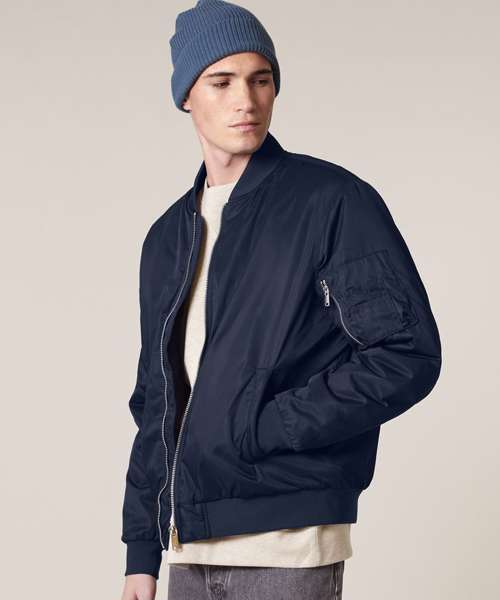 Premium unisex bomber jacket in 100% recycled polyester. Timeless, versatile style in a medium fit. Improved padding and decoration results. Ideal for music merchandise.