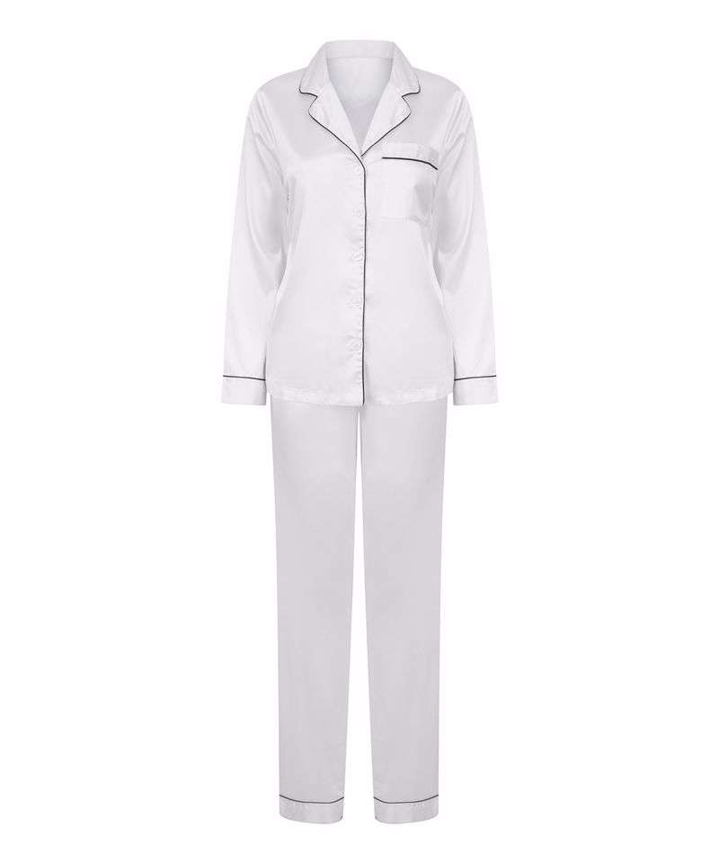 Stretch satin long sleeved shirt and long pants pyjama set. Centre front button fastening down the centre front. Front breast pocket. Contrast piping detail. Pants with elasticated waistband and self fabric drawcord.