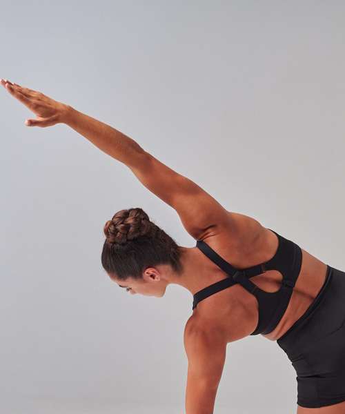 Women's core bra with medium impact. Round neckline with cross over elastic strap back. Bra clasp fastening. Permanent cups, non removeable. Tear-out label.