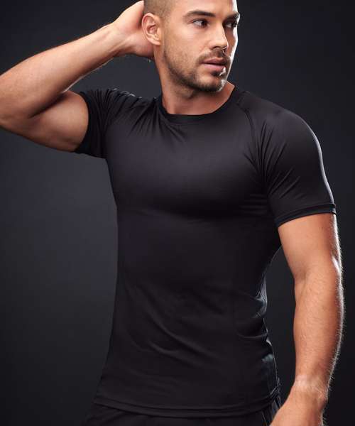Slim fit t-shirt, 2 piece sports crew neck, shaped raglan sleeves, mesh side panels and back yoke.