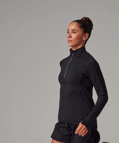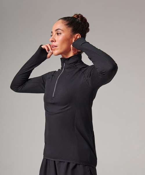 Train smarter in our ultimate 1/4 zip. Reflective zip tape and dot design on the reverse ensures maximum visibility, while the sports thumbholes and discreet fold over cuffs are perfect for when the temperature drops. The single Jersey fabric with wicking finish keeps you cool and dry, helping you to perform at your best.