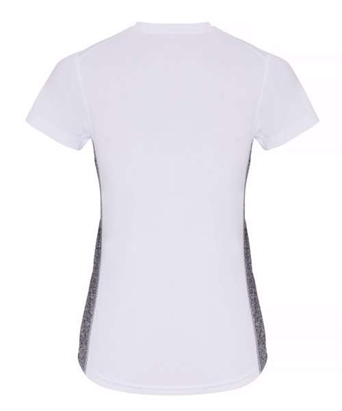 Wicking fabric. Contrast side panels in melange fabric. Stretch. Crew neck. Short sleeve. Lightweight. Twin-needle stitching on hem and arms. We recommend using block out vinyl and inks.Product contains no branded neck or waist label. Removable Kimble or looped garment tags. Inner seam label holds important product information on one label with a second label containing brand information which can be cut-away.