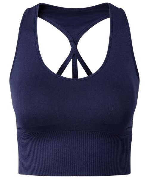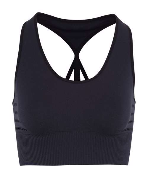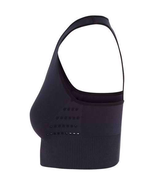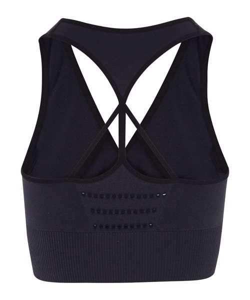 Seamless sports bra. Ribbed waistband. Elastic racer back strap. Breathable eyelet detailing. Medium impact. We recommend using block out vinyl and inks.Product contains no branded neck or waist label. Removable Kimble or looped garment tags. Inner seam label holds important product information on one label with a second label containing brand information which can be cut-away.