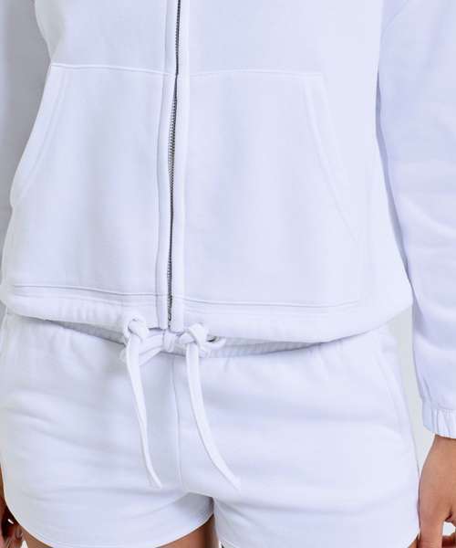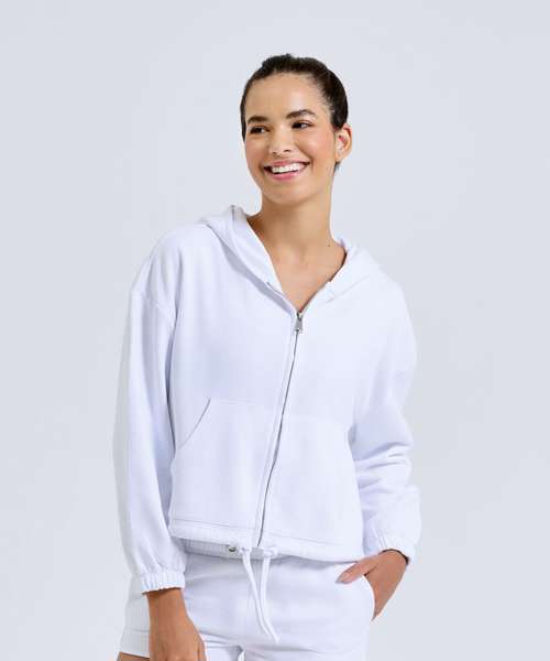 Oversized, cropped, zipped hoodie. Zip to centre. Drawstring tie to waist. Kangaroo pockets to front. Contains recycled polyester fabric. The product contains no branded neck or waist label. Removable kimble or looped garment tags. The inner seam label holds important product information on one label with a second label containing brand information which can be cut-away.