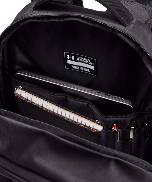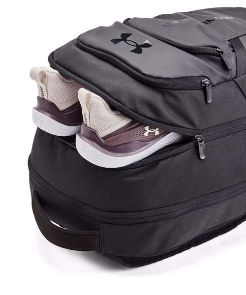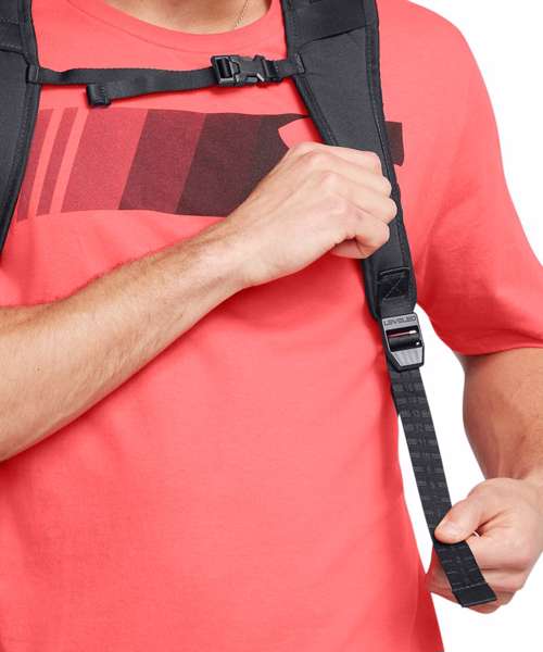 Water-resistant UA Storm technology keeps your essentials dry. LEVELED™ strap system guides you to assure straps are adjusted evenly for balanced weight distribution. Soft-to-the-touch top coat on material for added durability. Soft-lined laptop sleeve – holds up to 16" MacBook Pro or similar-sized laptop. Secondary compartment can be dual-purposed as a shoe/laundry pocket. Secure zip front pockets for essential item storage and side water bottle pocket that accepts 32oz bottle. Adjustable, removable UA Strap Clip™ on shoulder to prevent duffle bag from falling off when carrying both. Strap clip works best when sternum clip is fastened.