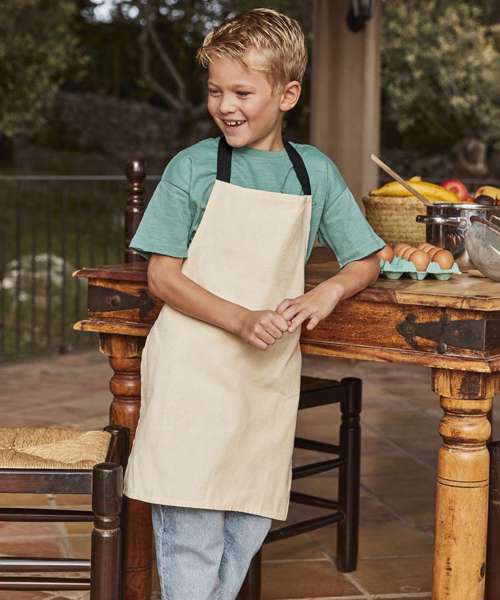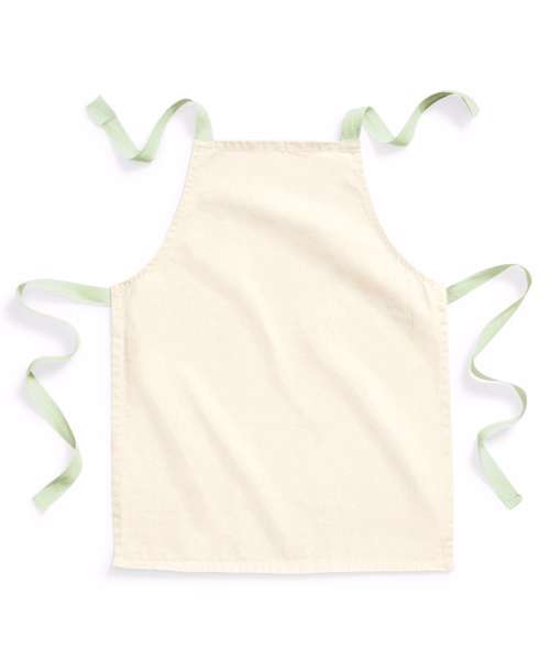 Full bib apron. Cotton Herringbone neck tie with adjustable Rip-Strip™ fastening safety closure. Cotton Herringbone 60cm waist ties. Fairtrade certified.